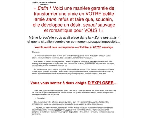 Vous avez mis en lumière BEAUCOUP des erreurs que j’ai commises en essayant de la conquérir. Ce qui m’a donné le plus de valeur est la manière dont vous donnez vos instructions jour après jour afin de changer les choses. J’avais perdu tout espoir le jour où elle m’a dit qu’elle ne voulait qu’être mon amie.