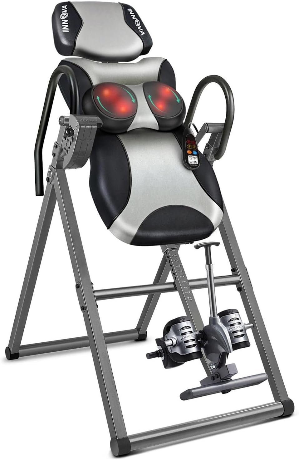 Invert with Innova’s ITM5000, a heavy-duty inversion table that features an innovative Shiatsu Back Massager with Soothing Heat. The massage unit enhances the effects of inversion therapy by simultaneously stretching the spine and relieving muscle tension. With four (4) nodes, the Shiatsu Massager delivers deep tissue pressure while in the reclined or inverted position. Since one’s inversion experience is guided by each individual’s unique center of gravity, the True Balance System incorporates a three-part adjustable system (Height, Headrest and Backrest) that allows users to fine tune their table for the smoothest inversion experience. Like Innova’s other inversion tables, the Innova ITM5000 uses a unique and convenient angle slot pin system that comes with a patented protective cover for pinch prevention. To adjust, simply return to the upright position and move the pin to your desired inversion setting. With six settings, users can vary the level of decompression: starting with a very mild slope of inversion to a fully inverted upside-down position. This table also features an ergonomic ankle holding system with patented No Pinch VCC-Tech U-shape Holders designed to lessen the pressures on the ankles and legs while inverting. The extended handle reduces the forward bending motion when mounting or dismounting the table for users with lower back pain. The ITM5000 is a versatile product that can accommodate users from 4’10” up to 6’6” and its heavy-duty frame utilizes sturdy 38 mm square tubes capable of handling up to 300 pounds. The Innova ITM5000 Inversion Table allows users to stretch, decompress, and relieve muscle tension comfortably by providing a new kind of inversion experience.