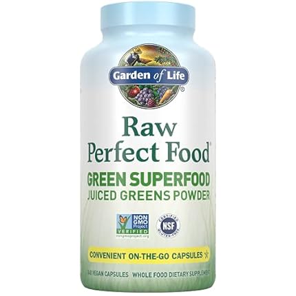 Garden of Life Raw Perfect Superfood Juiced Greens Powder Capsules, Non-GMO, Gluten Free, Vegan Whole Dietary Supplement, Organic, Sprouts Probiotics, 240 Count