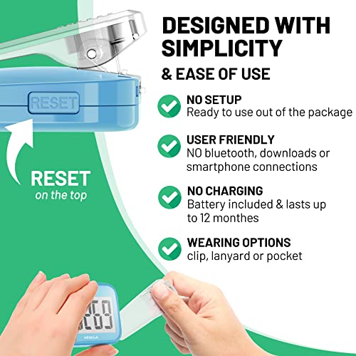 SIMPLE & EASY TO USE: 3D Pedometer for Steps Only. No Bluetooth, no app or smartphone connections required. Only one reset button, To reset the counter, just only need to press and hold the RESET button for 3-5 seconds to get the step to “0”.