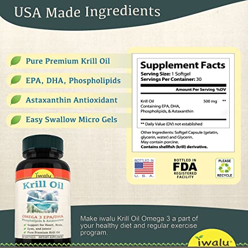QUALITY USA BRAND PRODUCT | iwalu krill are wild harvested using sustainable fishing practices – never farm raised. Our Antarctic krill live in the world’s purest waters. They spend their days happily avoiding many of the toxins, chemicals, and heavy metals – like mercury, that many larger fish accumulate. Our softgels are Gluten-Free, Non-GMO, Tested for quality, purity and potency.