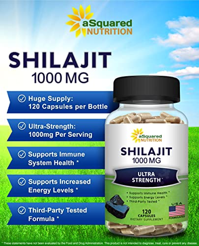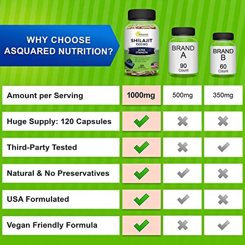 MAX STRENGTH: aSquared Nutrition’s maximum strength Shilajit formula contains 1000mg of Shilajit extract per serving. With 120 capsules in each bottle, you receive a full 60-day supply. Don’t settle for other formulas that only offer 60 or 90 capsules, tablets or pills, or that only contain 250mg or 500mg of Shilajit per serving. *
