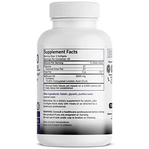 CLA is produced from Linoleic Acid (LA), which is part of a family of isomers found in CLA. CLA fatty acids are also known as CLA isomers. CLA is primarily found in select meats, dairy products, and other food items. And, since the body does not produce this fatty acid, it must be obtained through the diet or supplementation. Studies have shown that when dietary amounts of CLA are increased, CLA levels in body tissues increase, which can help maintain lean body mass. Bronson’s CLA 3000 provides active CLA from safflower seed oil. In addition to being effective, research has also shown CLA to be safe when used as directed. Bronson’s CLA delivers 3000 mg. of pure safflower seed oil, providing 75-85% active CLA per serving. That’s a minimum of 4500 mg. of CLA from a four-capsule daily serving. For best results, take two softgels two times daily with meals as part of a healthy diet and lifestyle. CLA 3000 does not contain any central nervous system stimulants. Non-GMO. These statements have not been evaluated by the Food and Drug Administration. This product is not intended to diagnose, treat, cure or prevent any disease.
