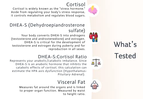 4-IN-1 ADRENAL HEALTH & FUNCTION / STRESS TEST: Our comprehensive Adrenal / Stress test kit allows users to test and track 4 key markers of internal adrenal health (Cortisol,DHEA-S, DHEA:Cortisol ratio & Visceral Fat).