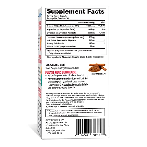 Powerful 7-in-1 Formula: We uses high enough doses to work with NO filler ingredients. Each daily dose includes Cinnamon, Banaba, Chromium Picolinate, Milk Thistle, Magnesium Oxide, Vitamin B12, and Bilberry.