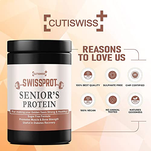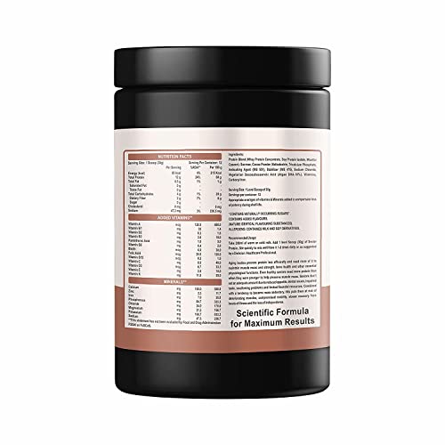 This Senior’s Protein Powder is enriched with Protein Blend (Whey Protein Concentrate, Soy Protein Isolate, Micellar Caseon). Sucrose, Cocoa Powder, Maltodextrin, Tricalcium Phosphate, Anticaking Agent (INS 551), Stabilizer (INS 415), Sodium Chloride, Vegetarian Docosahexaenoic Acid (Algae DHA-10%). Vitamins, Carbonyl Iron, Vitamins & Minerals