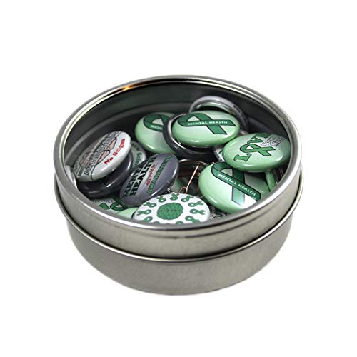 BEAUTIFULLY PACKAGED: Each set comes in a durable and reusable circular tin. With a nice viewing window on top, these buttons are ready to gift as is, or they may be opened and distributed at awareness walks, events, or other fundraisers.