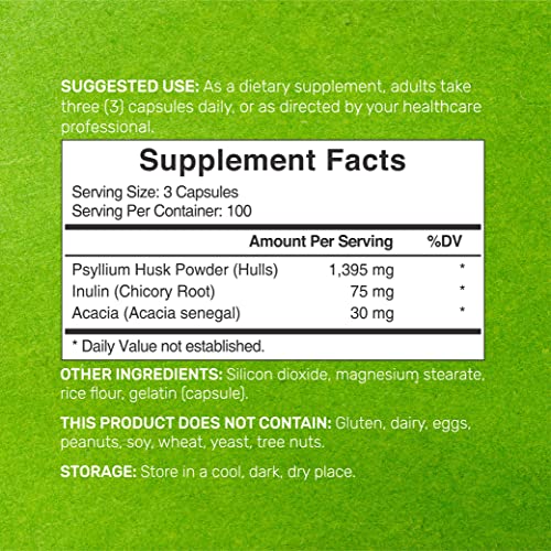 Dosage & Servings – Enjoy 300 capsules per bottle which is a 3 per day formula and offers a 100-day supply. That’s 1,500mg per serving from 1,395mg of Psyllium Husk Hulls, 75mg of Chicory Root Inulin, and 30mg of Acacia Senegal.