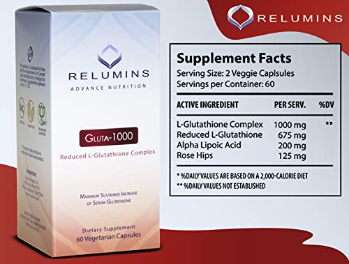Relumins Advance Nutrition – 1000mg Reduced L-Glutathione Complex 2X More Effective Than Jarrow at Raising Serum Glutathione, Antioxidant – Alpha Lipoic Acid, Rosehips – 180 Veggie Caps
