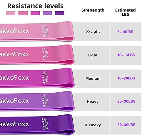 High end exercise bands. Our 12″ by 2″ heavy duty loop resistance bands come in 5 varying resistance levels. This makes them perfect whether you are just starting to workout or a seasoned workout warrior. Our extra light and light bands are great for beginners, while our medium, heavy and extra heavy exercise bands are targeted for more intermediate and advanced strength training.
