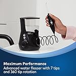 KEY FEATURES: 7 tips for multiple family members and needs, 10 pressure settings (10-100 PSI), removable 22 oz reservoir (top-rack dishwasher safe for easy cleaning), 90 secs of flossing time, 360 tip rotation, 120VAC/60Hz for use in North America only.