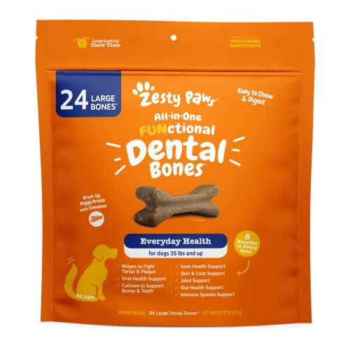 No More Boring Dental Sticks! – All-in-One FUNctional Dental Bones support periodontal health, fresh breath, plaque and tartar control for dogs, and more benefits for any large breed 35 lbs and up.