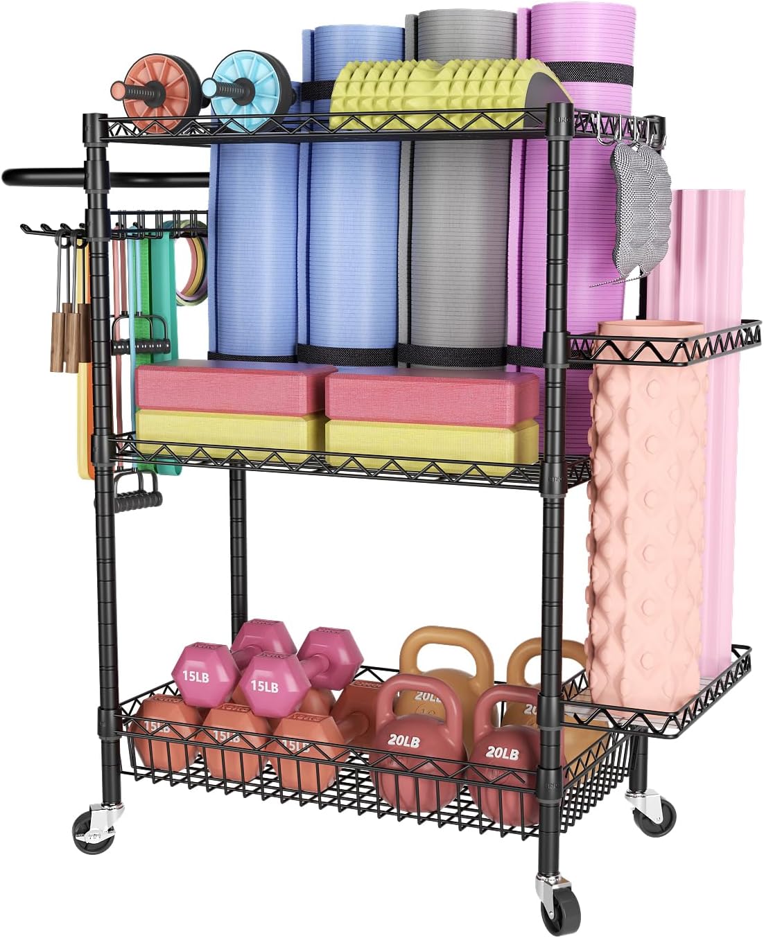 home gym organizer with side basket shelf , fit for yoga mats and foam rollers, side shelf adjustable freely for your storage needed
