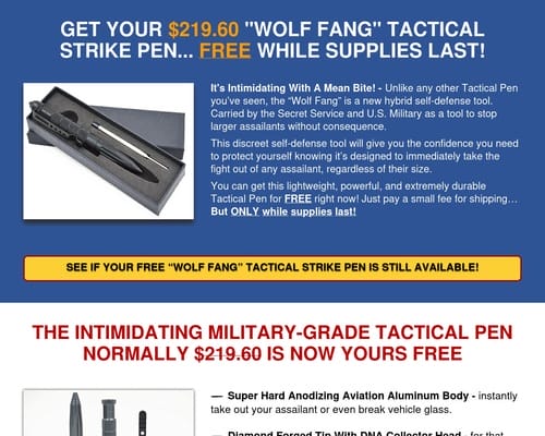 P.S. – Missing out on this deal is not worth the risk! The “Wolf Fang” Tactical Pen is the most reliable, powerful, and concealable self-defense weapon you can depend on at a moment’s notice…always there when you need it to defend yourself or your family! And it seriously doesn’t get any cheaper than FREE. Grab yours before you head out by covering the small shipping cost and it’s all yours absolutely free – but hurry before supplies run out!